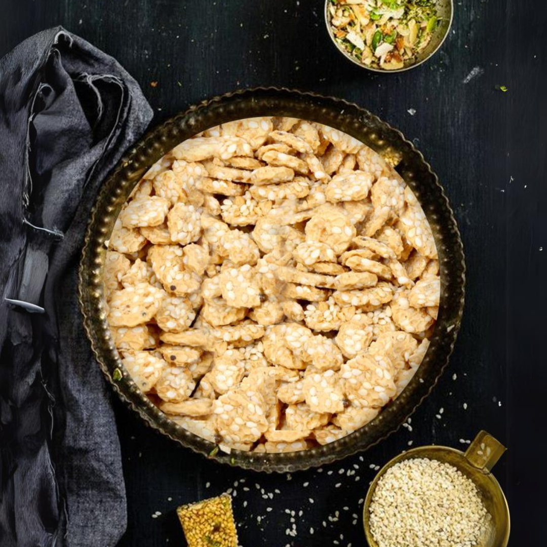Gud rewari is a traditional Indian sweet made of little gud nuggets coated with sesame seeds.